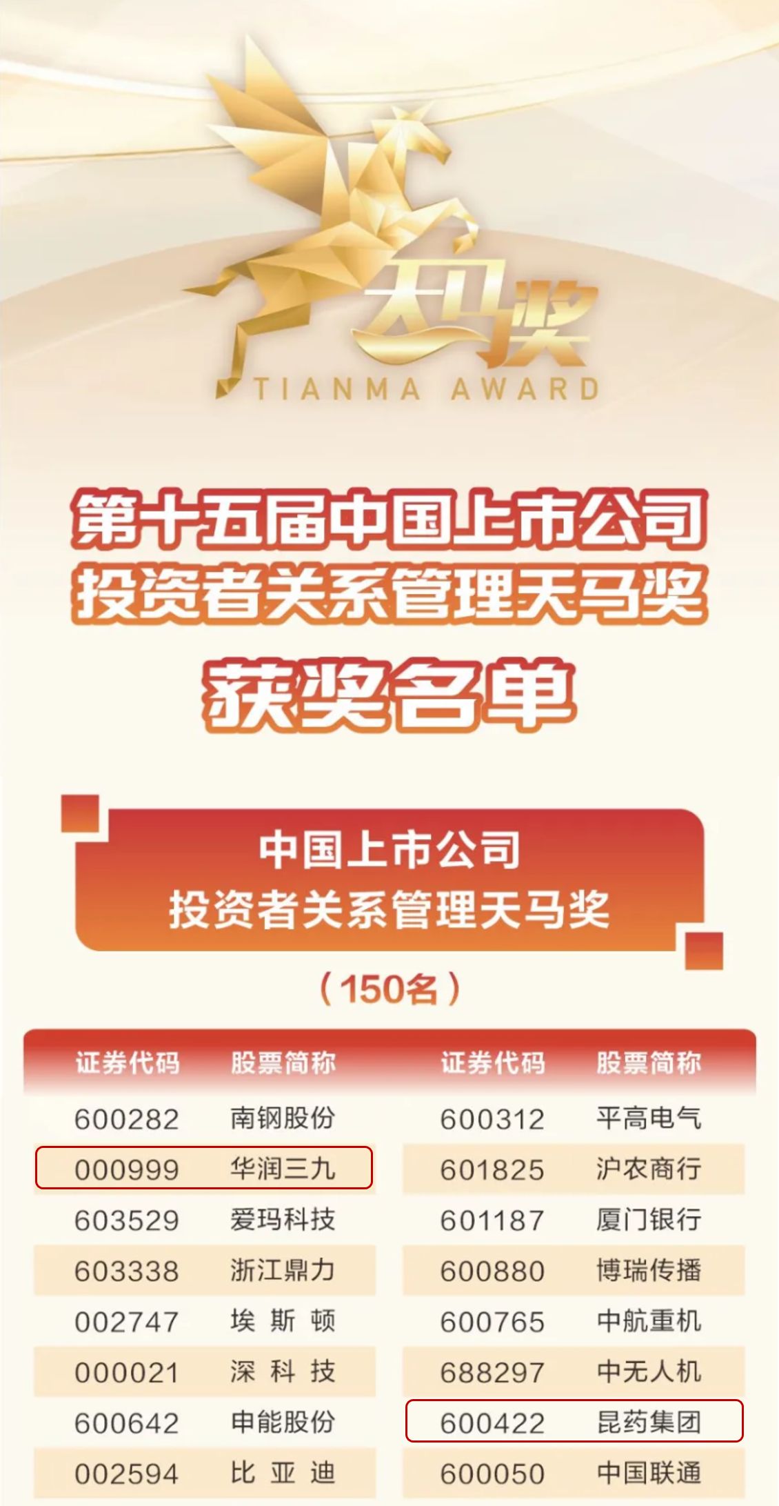 “天馬獎”于2009年創(chuàng)辦,是國內(nèi)主流媒體最早聚焦資本市場投資者關(guān)系管理領(lǐng)域的評選活動,在中國資本市場具有廣泛的影響力。本屆評選從投資者關(guān)系維護、財務(wù)質(zhì)量、市值管理、投資者回報、ESG表現(xiàn)五大維度,對上市公司進行綜合性評價。此次獲頒榮譽獎項,體現(xiàn)了資本市場對華潤三九和昆藥集團高質(zhì)量投資者關(guān)系管理、高合規(guī)信息披露、高效公司治理水平的肯定。