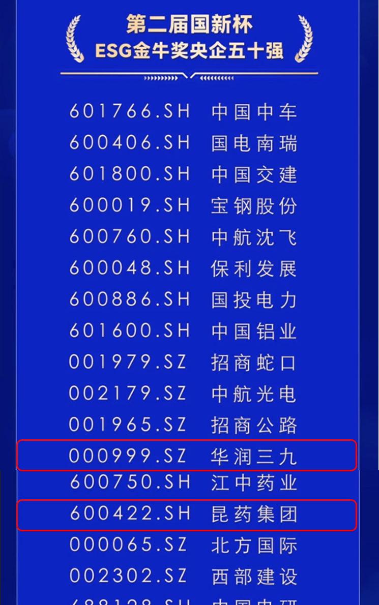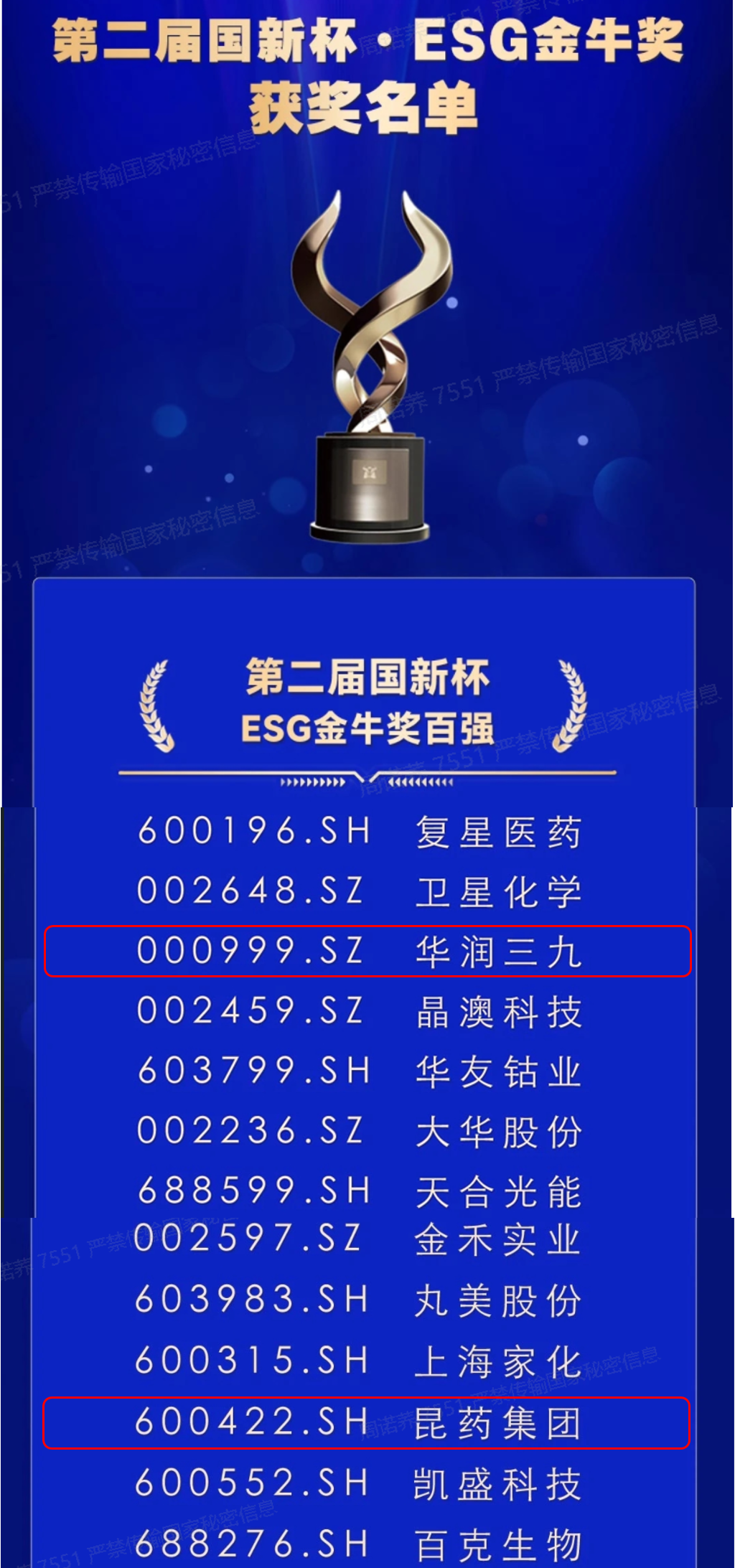 華潤三九及旗下昆藥集團同獲第二屆國新杯·ESG金牛獎兩個獎項