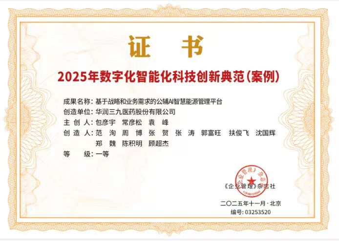 近日,2025企業(yè)改革與發(fā)展創(chuàng)新實踐交流會暨優(yōu)秀企業(yè)管理實踐成果(案例)發(fā)布會在北京召開。會上,華潤三九兩項實踐成果(案例)分別榮獲一等獎。其中,“基于系統(tǒng)工程理論的智能制造項目實施方法論研究”課題榮獲“國有企業(yè)深化改革實踐成果一等獎”,“基于戰(zhàn)略和業(yè)務(wù)需求的公輔AI智慧能源管理平臺”項目榮獲“數(shù)字化智能化科技創(chuàng)新典范(案例)一等獎”。
