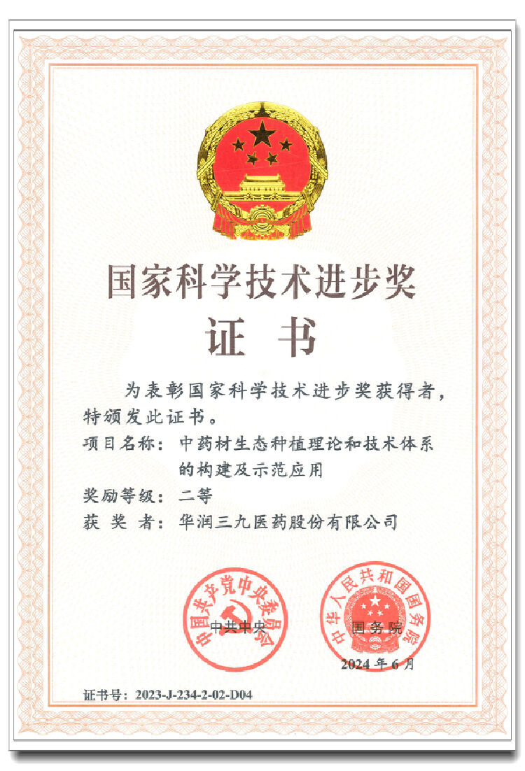 2023年度國(guó)家科學(xué)技術(shù)獎(jiǎng)勵(lì)大會(huì)日前在北京舉行。會(huì)上,華潤(rùn)三九參與的《中藥材生態(tài)種植理論和技術(shù)體系的構(gòu)建及示范應(yīng)用》項(xiàng)目再次榮獲國(guó)家科學(xué)技術(shù)進(jìn)步獎(jiǎng)二等獎(jiǎng),這是對(duì)企業(yè)高度重視研發(fā)創(chuàng)新并取得豐碩成果的肯定。此前,以公司產(chǎn)品 “參附注射液”“紅花注射液”“參麥注射液”“新泰林”“999理洫王牌血塞通三七軟膠囊”“青蒿系列”為研究對(duì)象的科研項(xiàng)目,先后榮獲國(guó)家科學(xué)技術(shù)進(jìn)步獎(jiǎng)二等獎(jiǎng)。