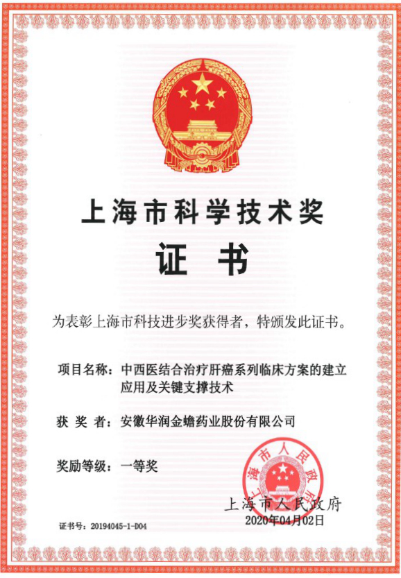 近日,安徽華潤(rùn)金蟾藥業(yè)股份有限公司收到上海市科學(xué)技術(shù)獎(jiǎng)一等獎(jiǎng)證書,這是華潤(rùn)金蟾2020年收獲的第三個(gè)省部級(jí)科技獎(jiǎng)獲獎(jiǎng)證書。