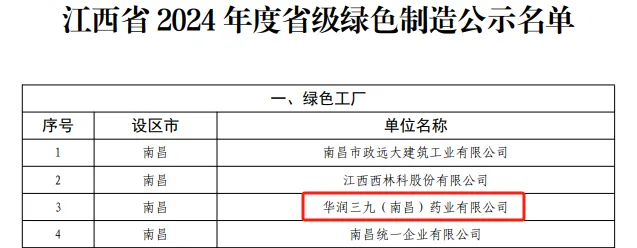近日,江西省工業(yè)和信息化廳公布了江西省2024年度綠色制造體系名單,華潤三九(南昌)藥業(yè)有限公司獲評(píng)“省級(jí)綠色工廠”。