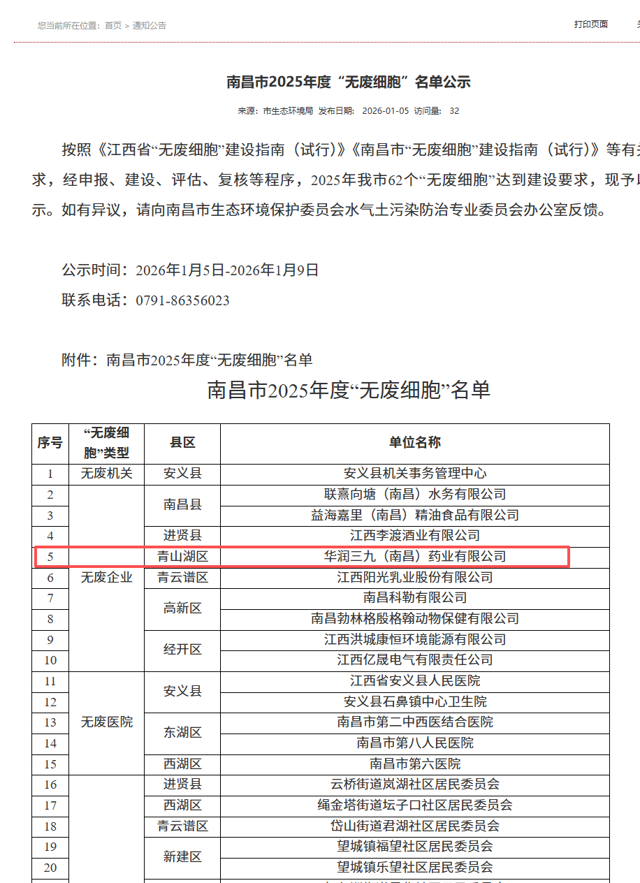 近日,南昌市生態(tài)環(huán)境局公布2025年度“無(wú)廢細(xì)胞”名單,華潤(rùn)三九(南昌)憑借在綠色低碳領(lǐng)域的實(shí)踐及成效,獲評(píng)南昌市“無(wú)廢企業(yè)”,為企業(yè)高質(zhì)量發(fā)展再添“綠色勛章”。