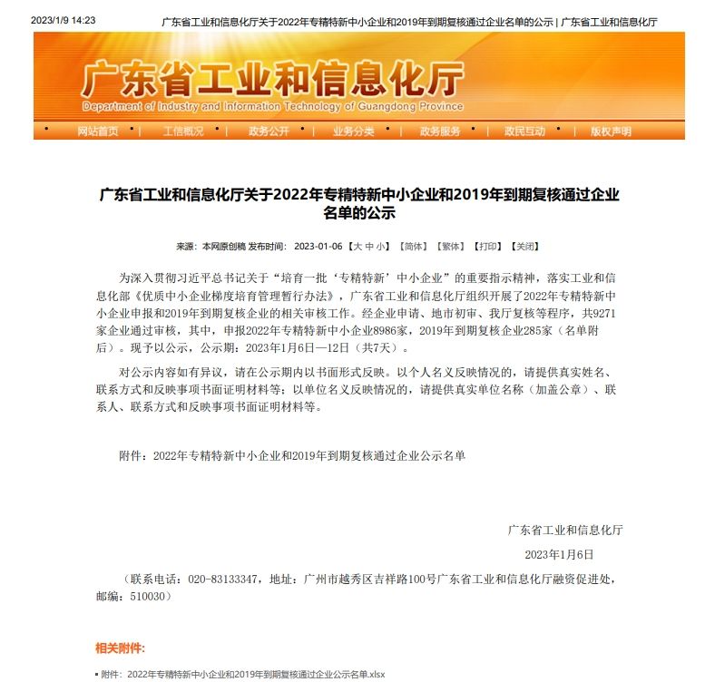 根據(jù)廣東省工業(yè)和信息化廳近期發(fā)布的《廣東省工業(yè)和信息化廳關(guān)于2022年專精特新中小企業(yè)和2019年到期復(fù)核通過企業(yè)名單的公示》,我公司被評(píng)定為廣東省“專精特新”中小企業(yè)企業(yè)。